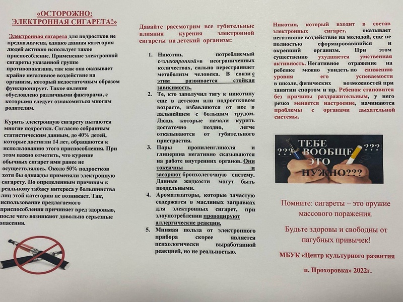 Сегодня на территории посёлка сотрудниками МБУК "ЦКР п.Прохоровка" была проведена акция "Чистый воздух". В ходе акции учащимся Прохоровской гимназии были вручены тематические буклеты, содержащие информацию о вреде электронных сигарет на организм человека. В современном мире, к сожалению, такой привычке как курение подвержены не только взрослые, но и дети. Многие современные подростки практически не расстаются со своими электронными сигаретами. Наслаждаясь ароматизированным паром, выпускаемым из легких, подростки даже не задумываются, что существует вред электронных сигарет для детей. У подростков очень быстро появляется зависимость к электронным сигаретам, которая со временем трансформируется в классическую табачную зависимость.